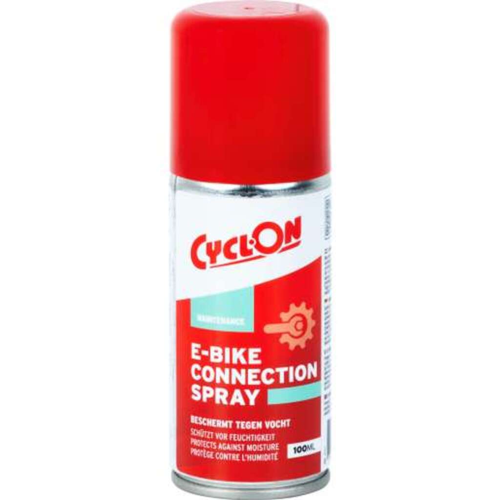 CyclOn E-Bike Connection/Contact Spray 100ml. Beschermt het relais, stekker en overige stroom gevoelige verbindingen tegen vocht, corrosie en oxidatie. Heeft licht smerende eigenschappen. Ook geschikt voor contacten van alle soorten tweewielerverlichting. Geschikt voor alle elektrische verbindingen en contacten.ÿVerkrijgbaar in een 100ml en 500ml spuitbus., 14070